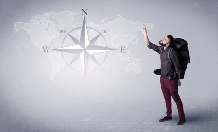 Handsome young man standing with a backpack on his back and a compass and a world map in the background