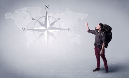 Handsome young man standing with a backpack on his back and a compass and a world map in the background