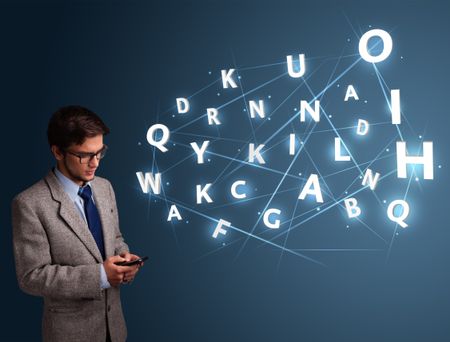 Handsome young man typing on smartphone with high tech 3d letters comming out