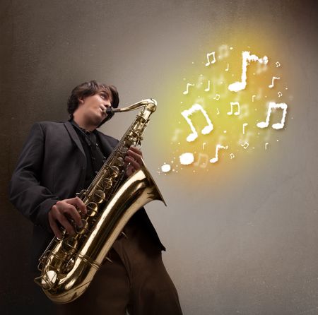 Handsome young musician playing on saxophone with musical notes
