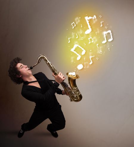 Handsome young musician playing on saxophone with musical notes