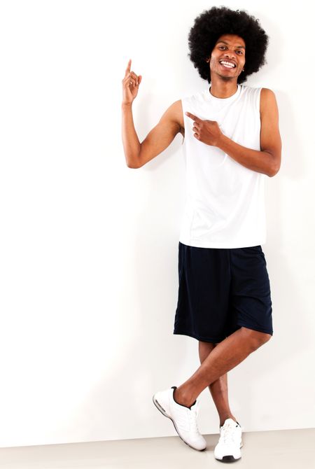 Happy black male athlete pointing up