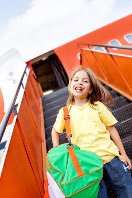 Happy boy going on holidays by airplane