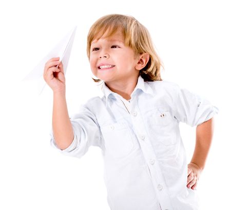 Happy boy playing with a paper plane - isolated over white background