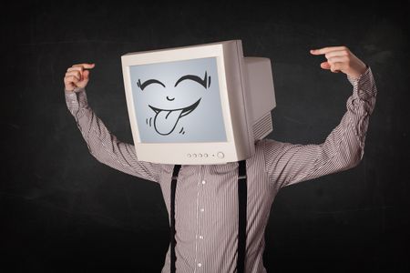 Happy business man with a computer monitor screen and a smiley face