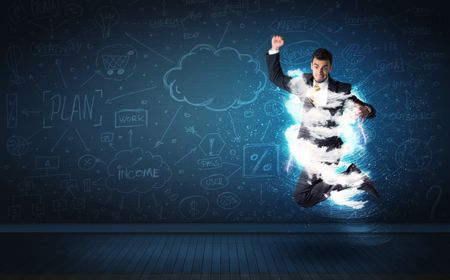 Happy business man jumping with storm cloud around him concept