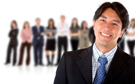 Happy business man leading a group- isolated over a white background