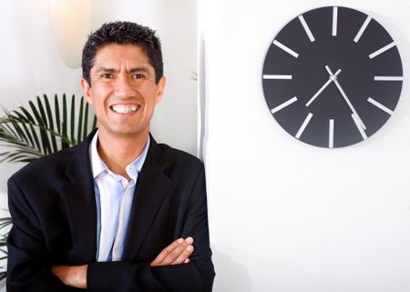 happy business man portrait in his office next to a clock