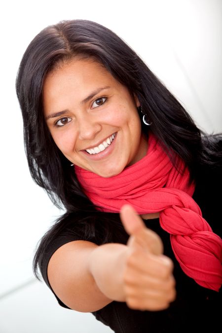 Happy business woman at the office with thumbs-up
