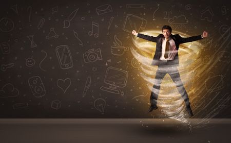 Happy businessman jumping in tornado concept on brown background