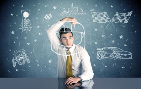 A happy businessman sitting at desk and drawing race car, flag, helmet around himself with a white chalk concept
