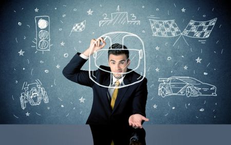 A happy businessman sitting at desk and drawing race car, flag, helmet around himself with a white chalk concept