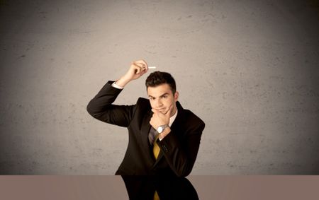 A happy businessman sitting at desk in front of clear grey empty background and drawing around himself with a white chalk concept