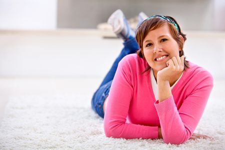 Happy casual woman lying on the carpet
