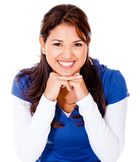 Happy casual woman smiling - isolated over a white background