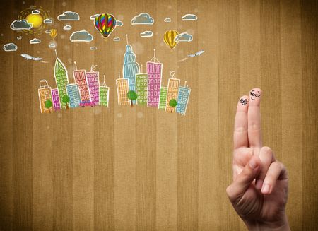 Happy cheerful smile fingers looking at colorful handrawn cityscape