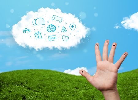 Happy cheerful smiley fingers looking at cloud with blue social icons and smybols