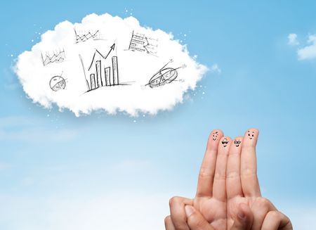 Happy cheerful smiley fingers looking at cloud with hand drawn charts