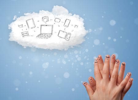 Happy cheerful smiley fingers looking at cloud computing with technology icons