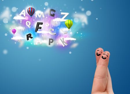 Happy cheerful smiley fingers looking at colorful magical clouds and balloons illustration