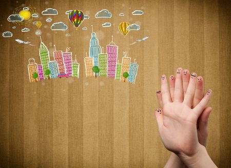 Happy cheerful smiley fingers looking at colorful handrawn cityscape