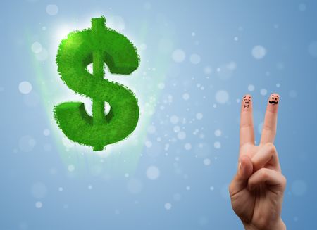 Happy cheerful smiley fingers looking at green leaf dollar sign