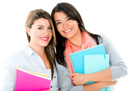 Happy college girls smiling - isolated over a white background
