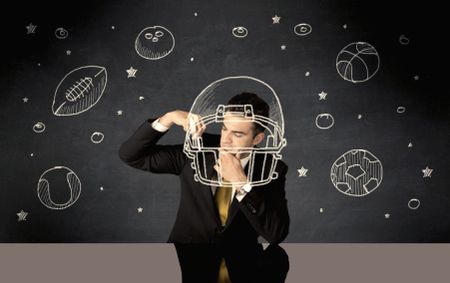 A happy college graduate dreaming about becoming a successful sports person while drawing helmet and ball in space concept