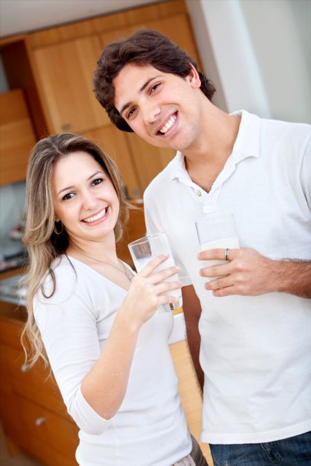 Happy couple with a glass of milk indoors