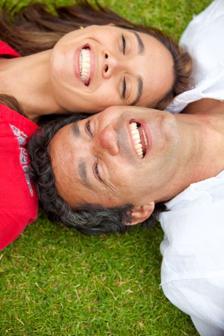 happy couple with their heads together on the floor outdoors