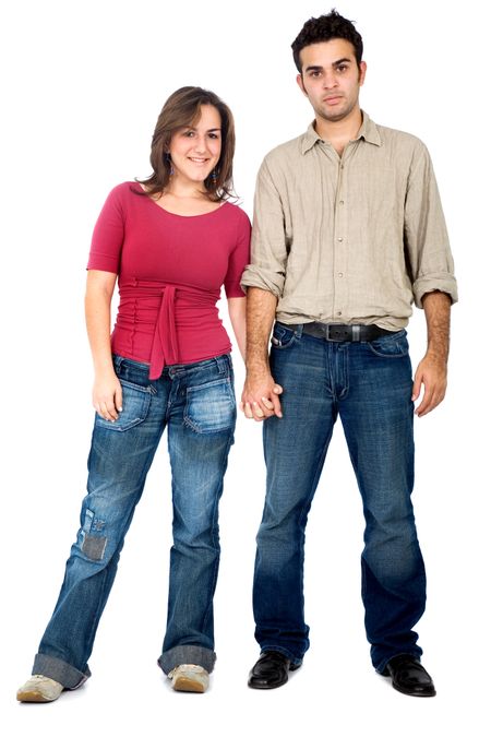 happy couple holding hands - isolated over a white background
