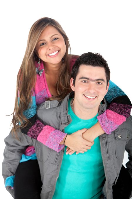 Happy couple hugging and smiling - isolated over a white background