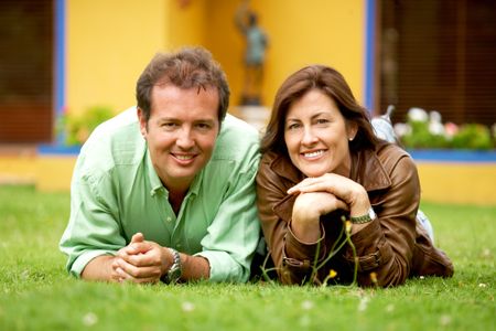 happy couple portrait outdoors lying on the floor outside their home