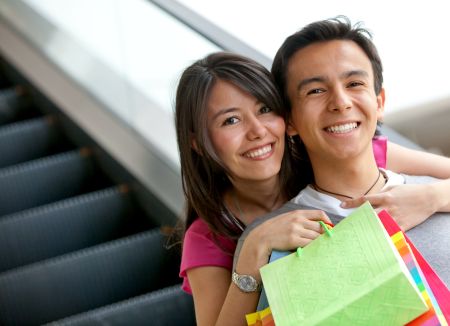 Happy couple at a shopping center with bags