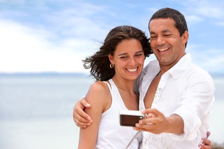 happy couple smiling at the digital camera while taking a photo