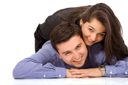 happy couple smiling on the floor - over a white background