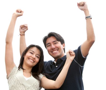 happy couple smiling outdoors with their arms up