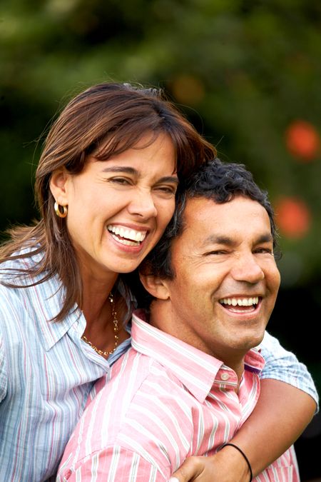 happy couple of young adults portrait smiling outdoors