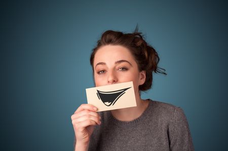 Happy cute girl holding paper with funny smiley drawing on gradient background