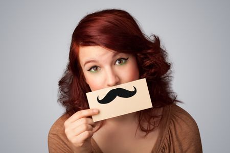 Happy cute girl holding paper with mustache drawing on gradient background