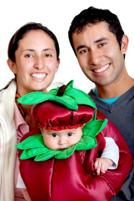 Happy family portrait of a baby with his mother and uncle over a white background