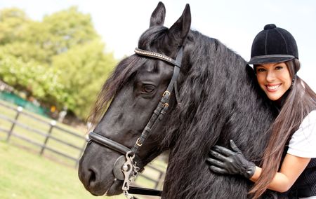 Happy female jockey riding a horse outdoors and smiling