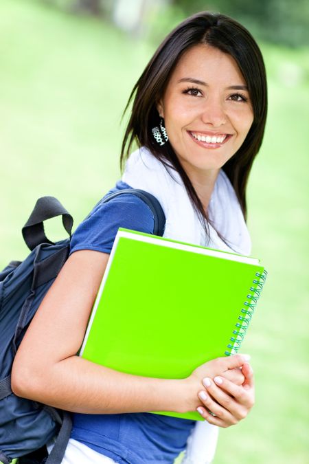Happy female student with backpack and notebooks smiling