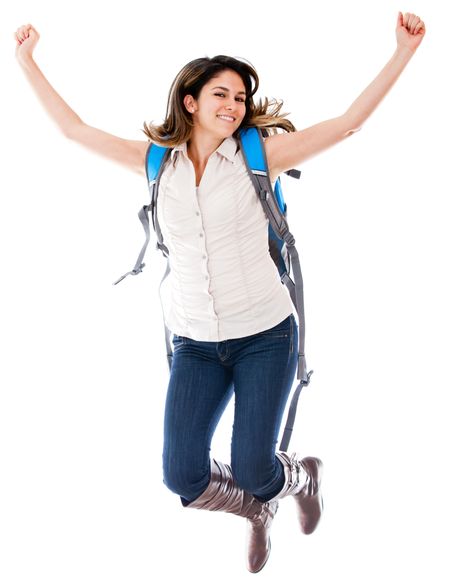Happy female student jumping - isolated over a white background