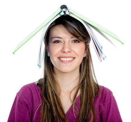 Happy female student with a notebook on top of her head isolated