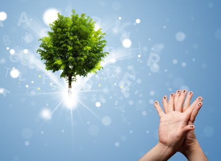 Happy finger smile faces on hand with green magical glowing tree