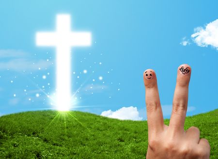 Happy finger smiley faces on hand with christian religion cross