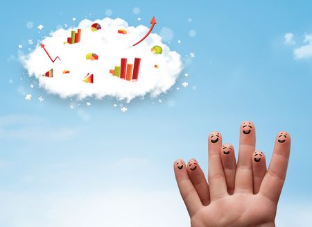 Happy finger smiley faces on hand with graph cloud icons in the sky