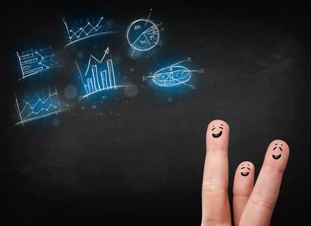 Happy finger smileys faces on hand with blue chart icons and symbols