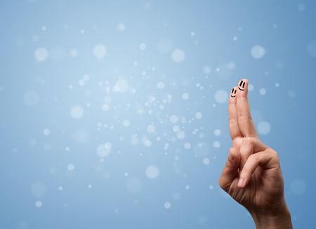 Happy finger smileys faces on hand with empty blue bokeh background